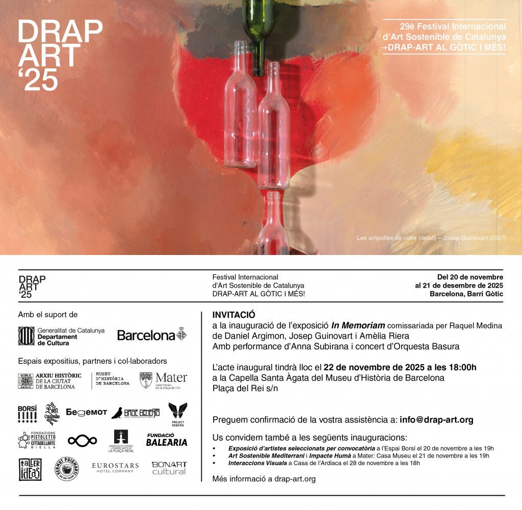 L’exposició In Memoriam proposa un recorregut per l’obra de tres creadors barcelonins que van marcar un abans i un després en la reutilització d’objectes quotidians amb intenció crítica, poètica i reivindicativa. Daniel Argimon i Granell (1929–1996) és una figura clau de l’informalisme català, que va experimentar amb la matèria, el collage i l’acció del foc, incorporant residus industrials i quotidians en obres que qüestionaven amb ironia la societat de consum. Amèlia Riera i Toyos (1934–2019) va desenvolupar un univers introspectiu i simbòlic, amb una obra marcada per l’obsessió per la mort, l’esoterisme i la crítica feminista, en què destaquen les seves sèries de maniquins reciclats i manipulats, com Eroticones (1968) i Electrotèrmiques (1978). Josep Guinovart (1927–2007), el més conegut dels tres, va ser un creador prolífic i polifacètic que va transformar bidons, fustes, caixes i objectes de rebuig en composicions matèriques carregades de memòria, ofici i compromís social i polític.